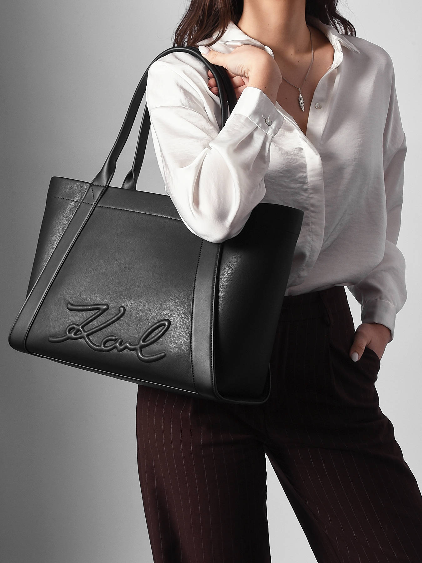 The K VILLE KARL LAGERFELD shoulder bag, made from P.U., combines practicality and urban elegance. Its 23 cm strap offers comfortable shoulder wear, ideal for everyday use. This compact and functional bag is designed to organize your essentials with ease. Inside, it features a card holder and can hold an A4-sized document, making it perfect for carrying files and papers during your professional or personal outings. Its modern and sleek design easily pairs with all outfits, from casual to sophisticated, while reflecting KARL LAGERFELD’s distinctive style. A practical and stylish accessory to accompany your daily life with elegance.