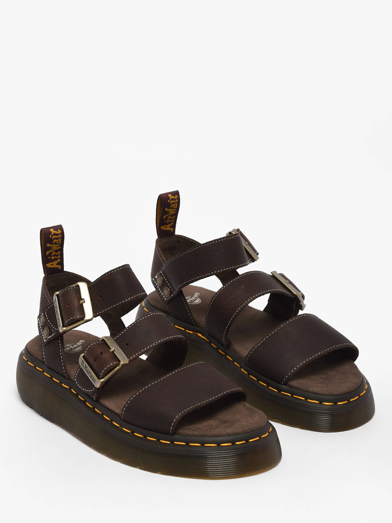 The Gryphon sandals from Dr Martens in dark brown Grizzly leather reinvent rock style for summer with boldness and comfort. Their thick leather with a subtle aged grain, combined with contrasting stitches and adjustable buckles, delivers a truly rebellious look. The ultra-high sole provides comfort and confident steps, while the logo pull-loop at the heel showcases Dr Martens’ iconic identity. Durable and versatile, these sandals are a must-have to carry summer in style, from city streets to the beach, showing off your unique and unapologetic rock spirit.