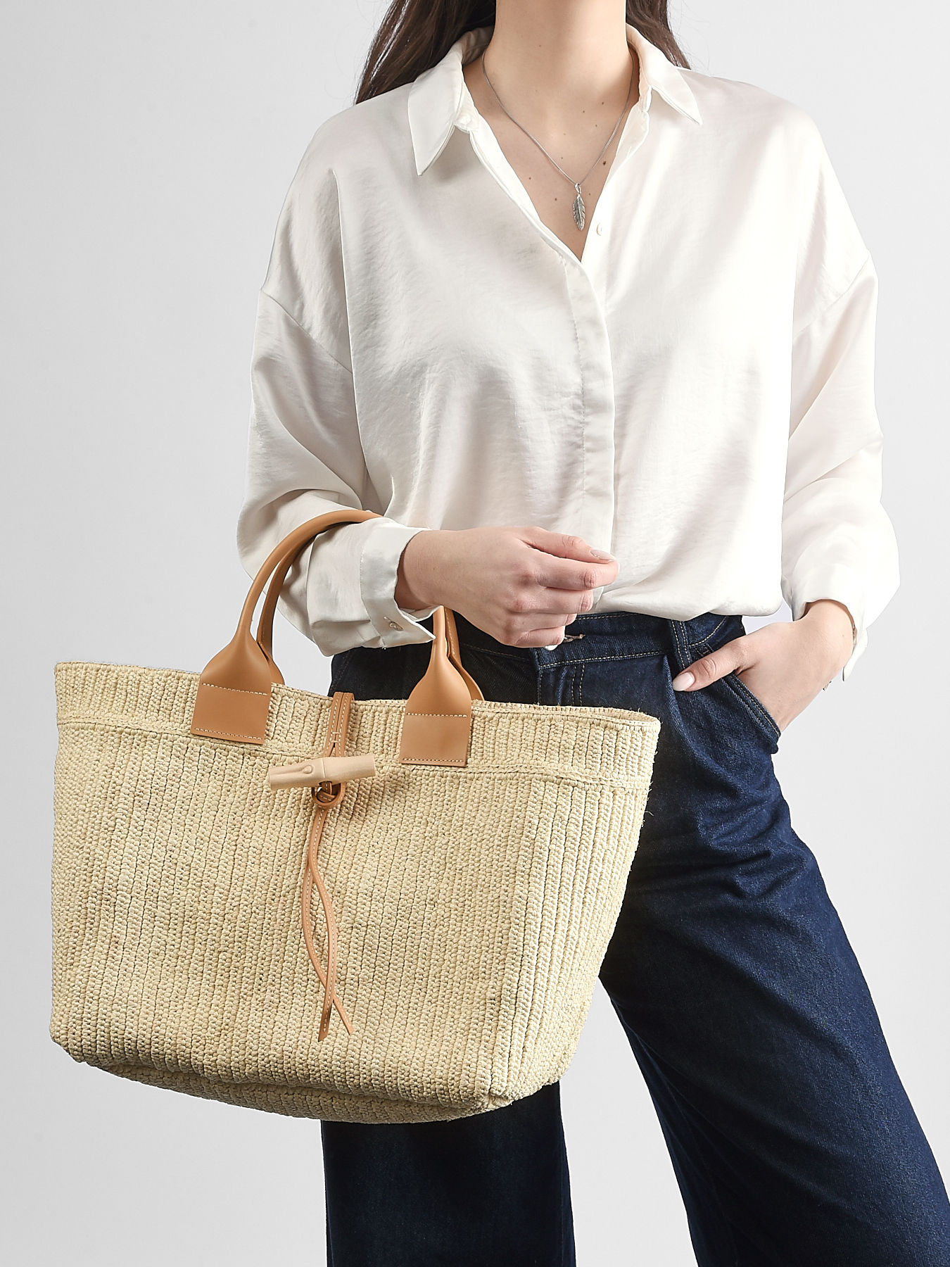 The Le Roseau L Tote Bag LONGCHAMP is an iconic piece combining craftsmanship, elegance, and social commitment. Handwoven in raffia using traditional crochet techniques, it is made in collaboration with Anaka, an NGO supporting female artisans in Madagascar. Every detail is carefully designed: calf leather finishes, vegetable-tanned leather handles with visible stitching, and the signature bamboo clasp carved from maple wood, tied with a leather cord, adding a natural and distinctive touch. With a 14 cm handle height, it is comfortable to carry by hand, and the interior features a single compartment with an embossed seasonal logo label. The Le Roseau tote perfectly embodies authenticity, style, and functionality, making it ideal for refined summer days or to elevate your outfits with a handmade, sustainable accent.
