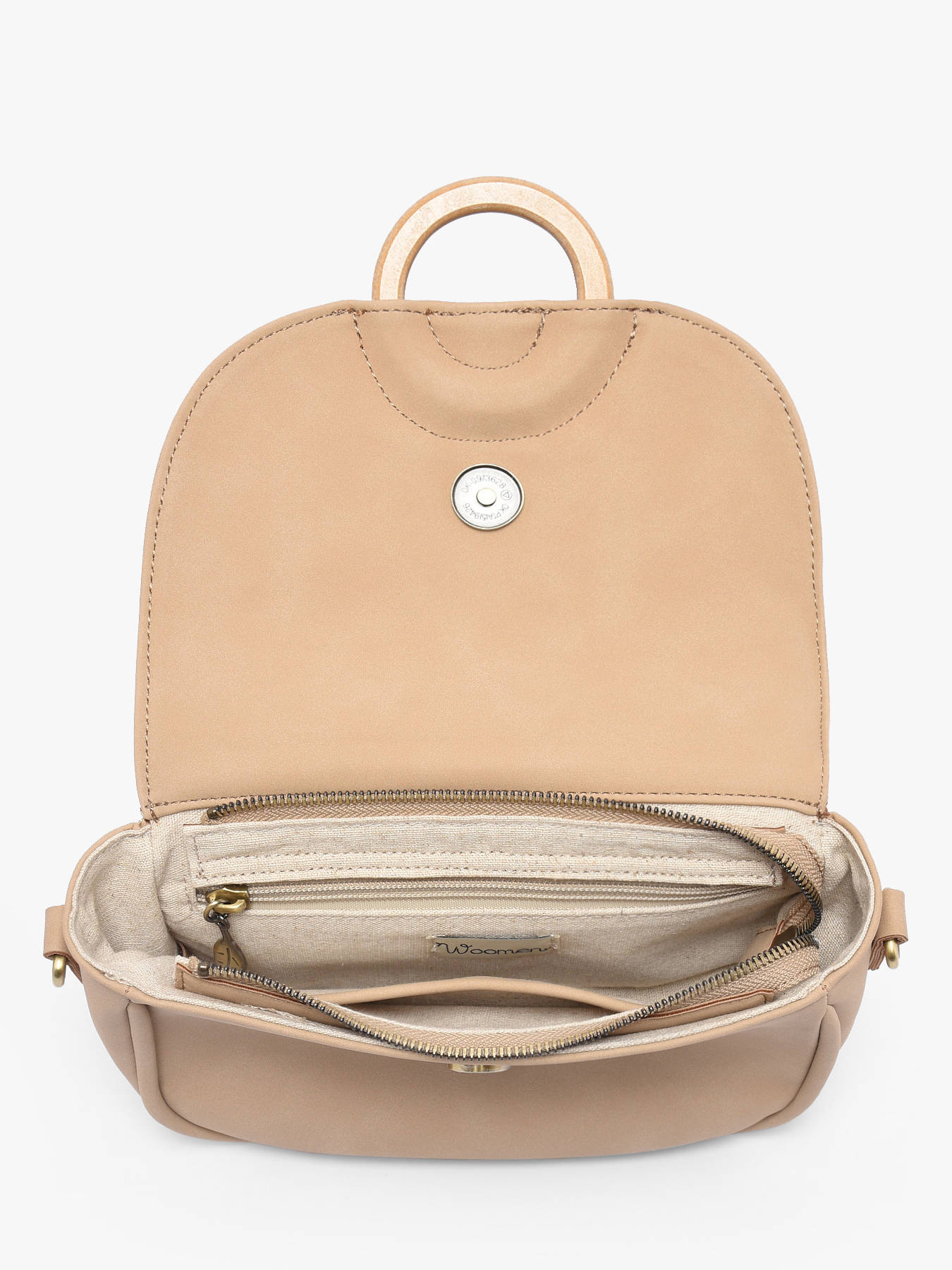The WOOMEN crossbody bag from the CROCUS line, made of polyurethane composed of 58% recycled materials with a cotton and linen lining, closes with a zip, flap, and magnet. It can be worn high on the shoulder, with a back pocket, a slip pocket, and an interior zip pocket. Its beige Woomen-printed strap and the wooden ring on the flap add an elegant touch.