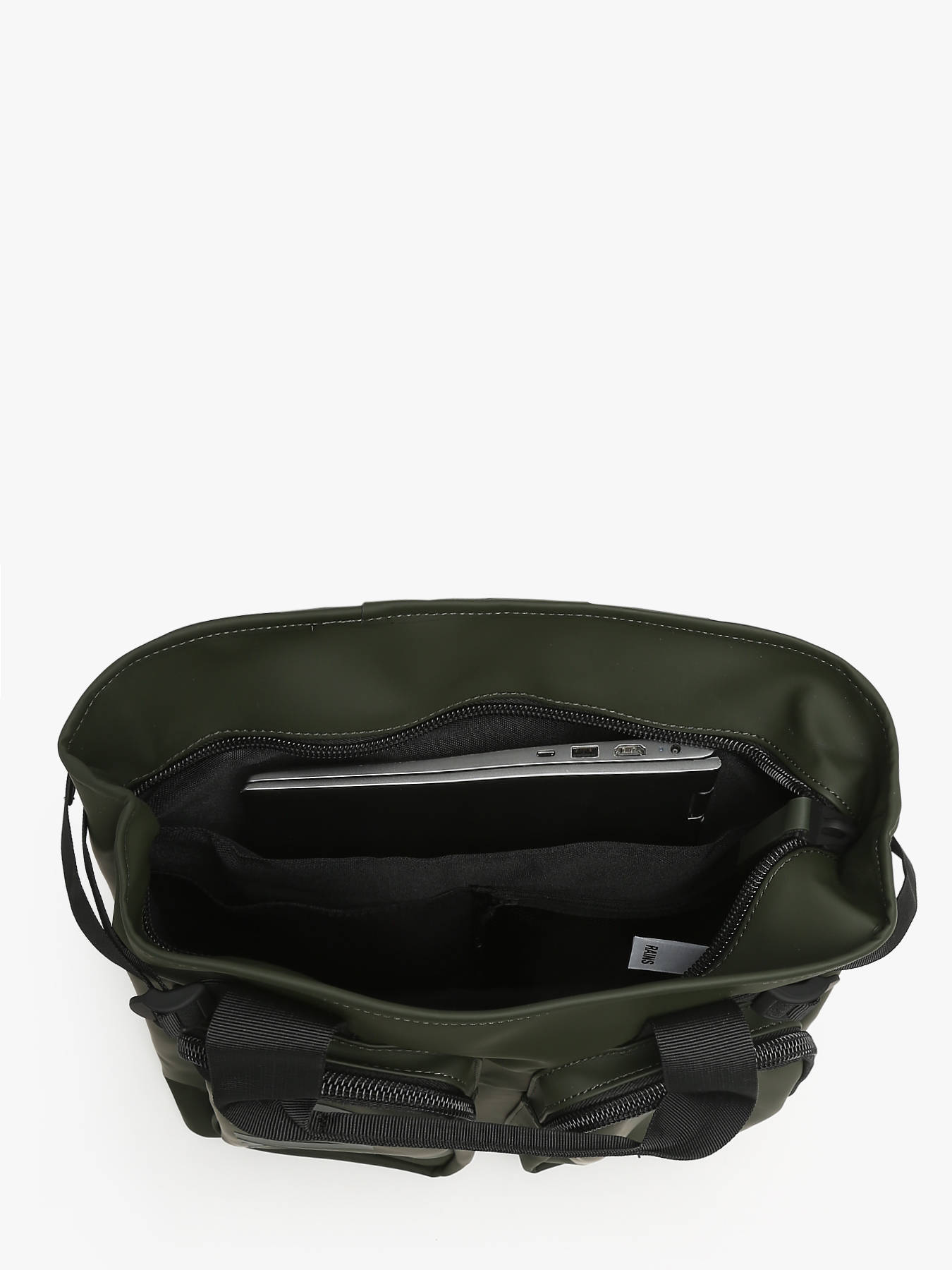 The RAINS business backpack in polyester is designed to blend functionality with elegant style. On the exterior, it features two front pockets and one back pocket, all zippered for easy access to daily essentials. Adjustable shoulder straps ensure a comfortable fit, while the support strap allows it to be secured to a telescopic handle for convenient use during travels. Inside, a spacious main compartment includes two simple pockets, one zippered pocket, and a padded sleeve for a laptop up to 16.4"". Perfect for professionals, it accommodates A4 files, a notebook, and a A4 folder, ensuring organization and protection for your important documents. The RAINS business backpack is the ideal companion for those seeking a perfect blend of modern functionality and sleek design.